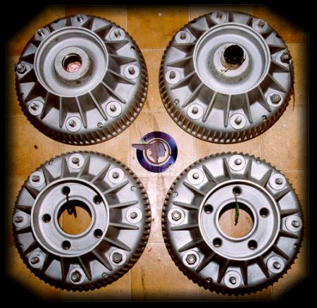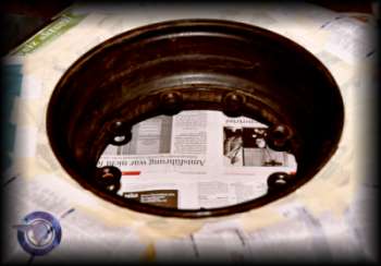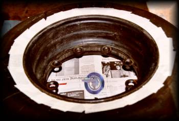 Reinigen der FelgeDie inneren Teile (Alutrommeln) wurden gestrahlt, um die Verschmutzungen und vor allem die restliche Farbe sauber zu entfernen. Wenn die Stahlringe nicht rostig sind, kann man sich das Demontieren der Reifen sparen, und diese nur mit Stahlbüsten reinigen und danach gut mit Lösungsmittel entfetten. |